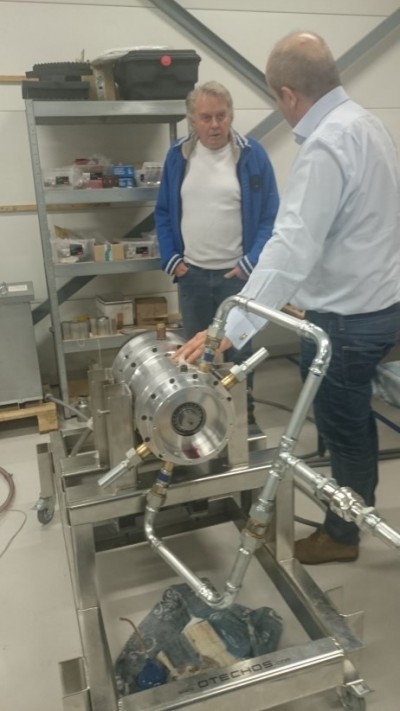 Tor Arne Hauge fortalte ivrig om Otechos produkter, de har flere patenterte produkter. Deres flensepumper som vel er grunnproduktet, deres forbrenningsmotor for gass ( CRteknologi) deres metalliske pakning (delta v-seal) og deres eget testutstyr for pakningen da det ikke fantes. Også denne patentert.